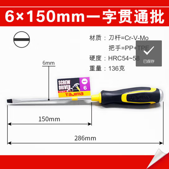 田岛TAJIMA 1301-2146 强力软胶柄一字贯通螺丝批6-150