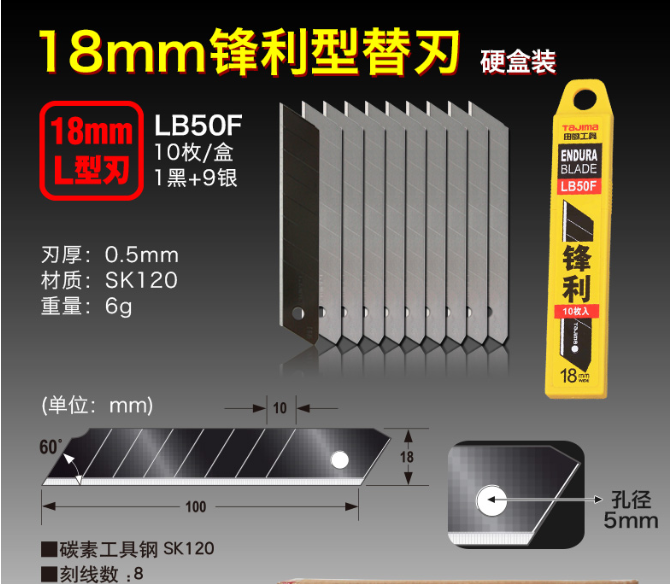 田岛(TaJIma)大号18mm宽美工刀壁纸刀墙纸刀替换刀片锋利型10片装LB50F 1102-0689