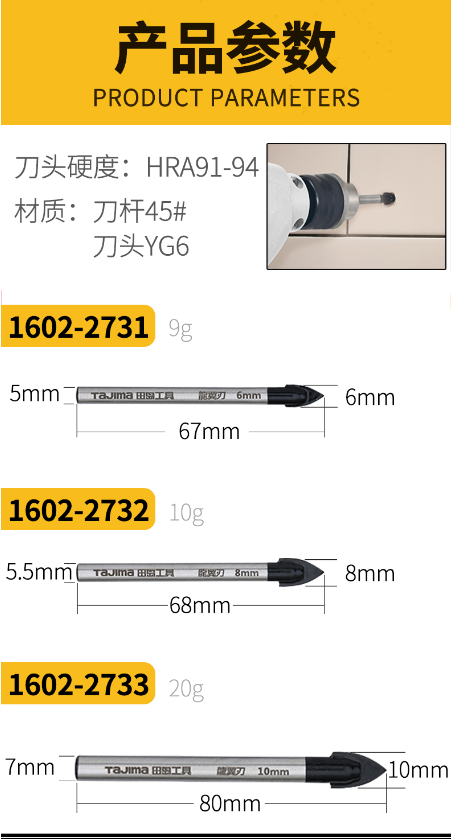 田岛tajima 三角钻头玻璃瓷砖水泥金属铁板多功能电钻打孔钻 6mm刀头五支装(1602-2731)