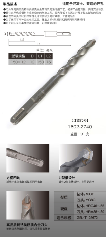 田岛(TaJIma)龙翼刃电锤钻方柄12X150XH 1602-2740