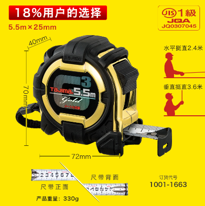 田岛tajima工具钢卷尺高精度木工装修拉尺家用圈尺5/5.5/7.5米盒尺 5.5米25mm卷尺 1001-1663
