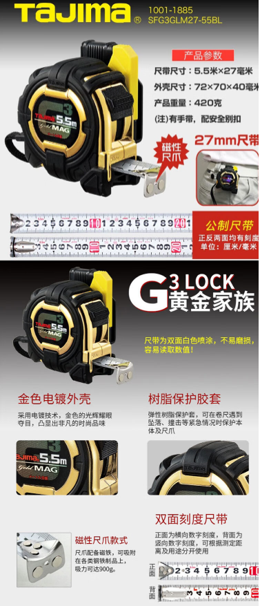 田岛tajima工具钢卷尺高精度木工装修拉尺家用圈尺5/5.5/7.5米盒尺 5.5米27mm卷尺【磁性带安全扣】1001-1885