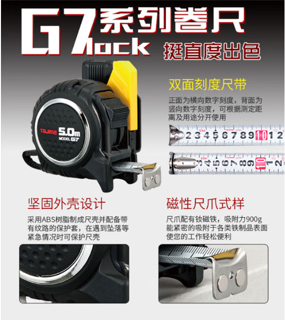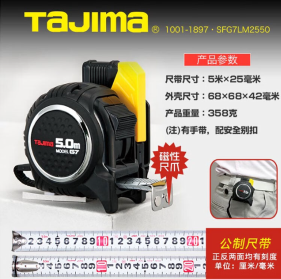 TAJIMA田岛卷尺包胶卷尺树脂套防滑抗冲击钢卷尺高精度加厚双面刻度尺带耐磨装修盒尺 1001-1897
