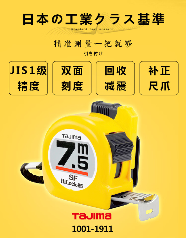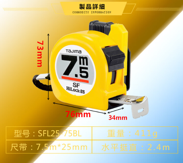 田岛(TaJIma)安全别扣卷尺木工测量7.5米SFL25-75BL 1001-1911