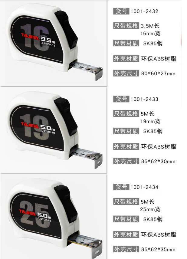 田岛TaJIma 卷尺钢卷尺自动锁定尺子双面刻度拉尺 1001-2433 5米*19mm