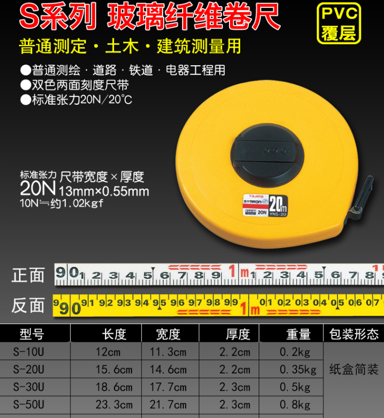 田岛(TAJIMA)S-50U 玻璃纤维卷尺S土木工程建筑测量工具50米1003-0046 PVC覆层防水双色双面刻度软皮尺