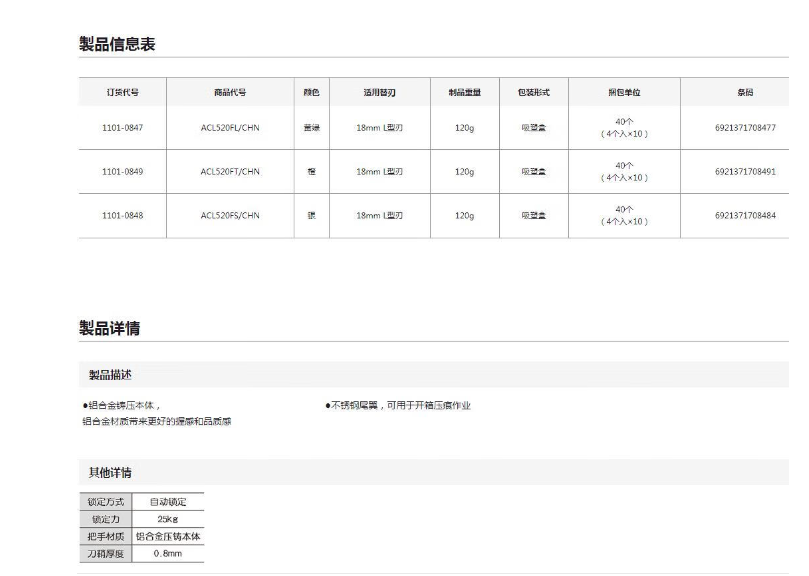 田岛(TAJIMA)铝合金美工刀520附尾翼银 1101-0848