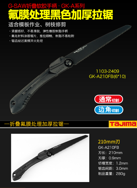 田岛(TaJIma)G-SAW折叠氟膜处理黑色210mm加厚锯片拉锯GK-A210FB 1103-2409