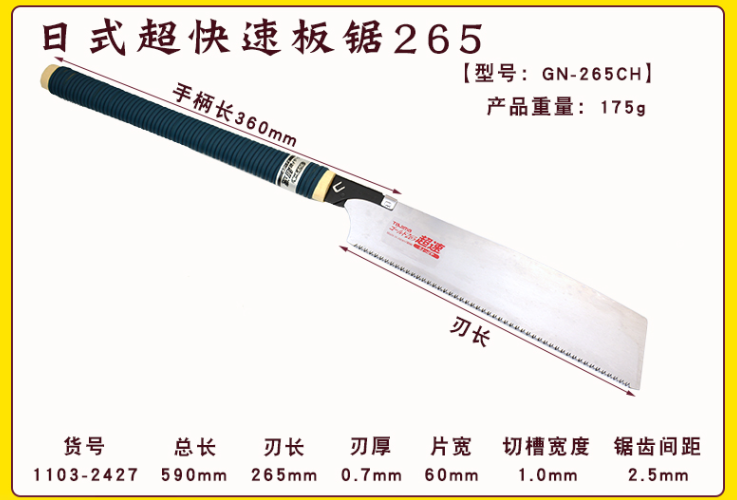 田岛(TAJIMA)GN-265CH 日式超快速板锯手锯木工锯子直柄刀锯园林伐木锯 1103-2427