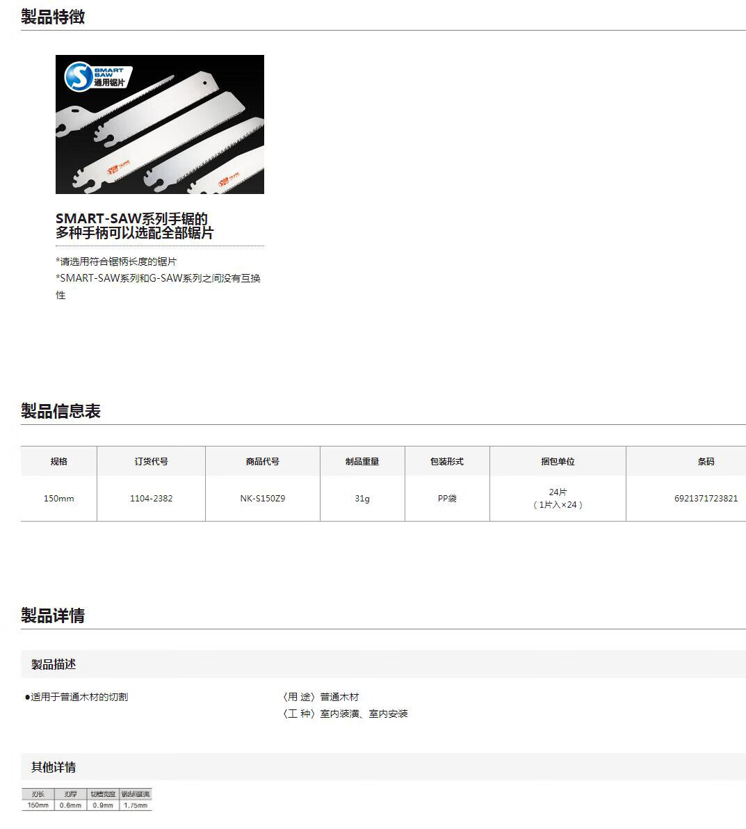 田岛(TAJIMA)SMART-SAW拉锯片150-9 1104-2382