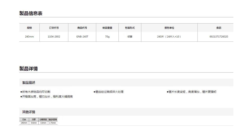 田岛(TAJIMA)日式快速板鋸片240耐久刃 1104-2602