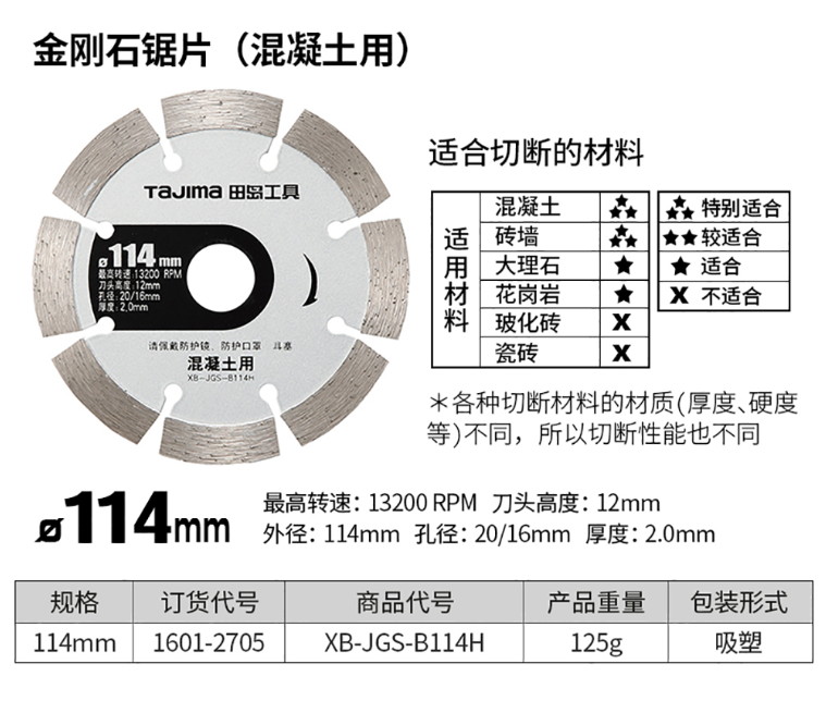 田岛(TAJIMA)XB-JGS-B114H PRO系列混凝土用金刚石锯片石材切割片通用锯片 1601-2705