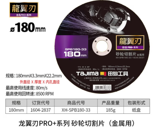田岛(TaJIma)龙翼刃砂轮切割片 180X3.3X22.2XH 1604-2837