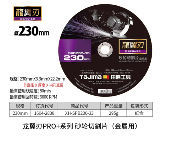 田岛(TaJIma)龙翼刃砂轮切割片 230X3.3X22.2XH 1604-2838
