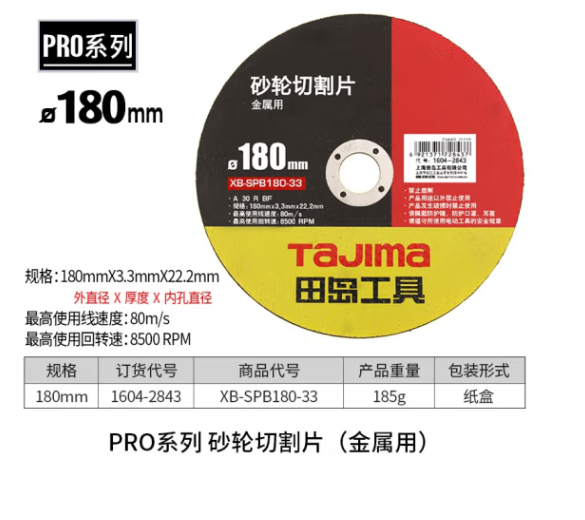 田岛(TaJIma)砂轮切割片 180X3.3X22.2XB 1604-2843