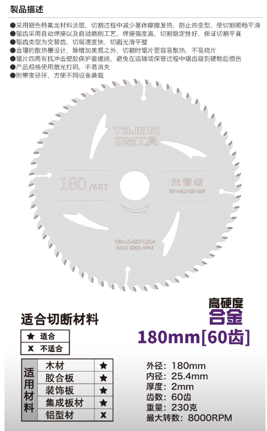 田岛(TaJIma)木工圆锯片180X2.0X60TX25.4XB-1605-2725