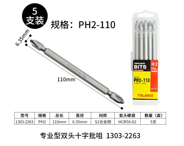 田岛(TAJIMA)PH2-110 加长电动螺丝刀批头十字双头批咀S2起子头带磁性 1303-2263