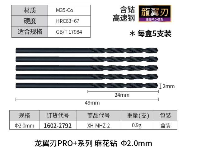 田岛(TAJIMA)日本田岛工具直柄麻花钻头高速钢钻头麻花钻头打孔钢铁含钴钻头钻 麻花钻2mm(5支装) 1602-2792