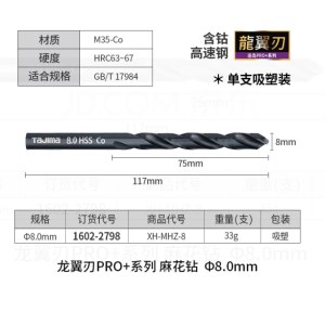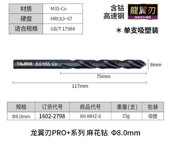田岛(TAJIMA)日本田岛工具直柄麻花钻头高速钢钻头麻花钻头打孔钢铁含钴钻头钻 麻花钻8mm 1602-2798