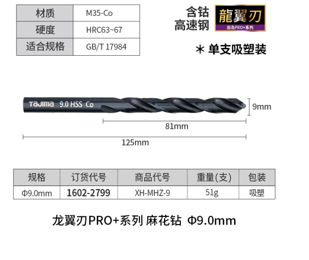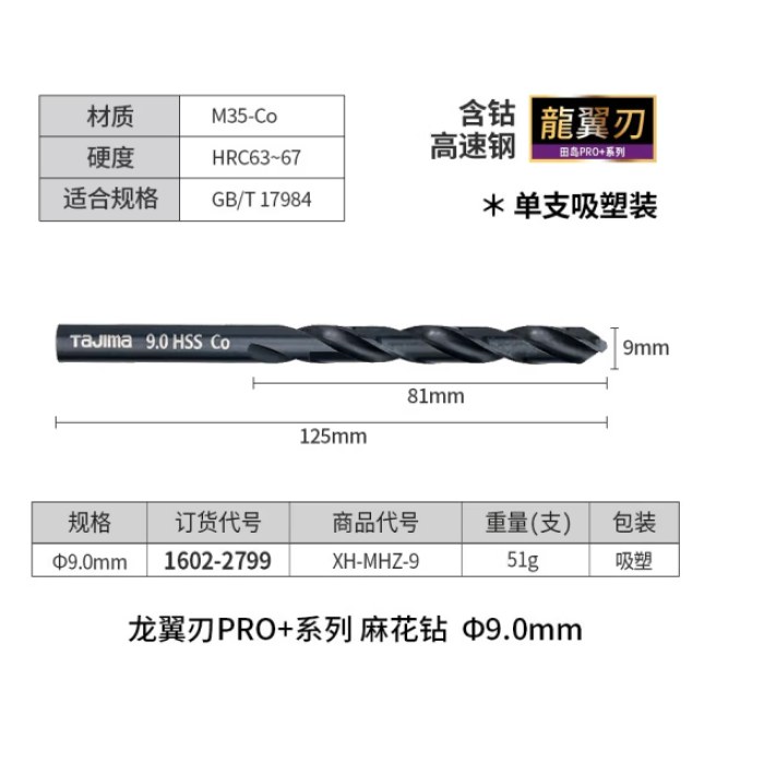 田岛(TAJIMA)日本田岛工具直柄麻花钻头高速钢钻头麻花钻头打孔钢铁含钴钻头钻 麻花钻9 mm1602-2799