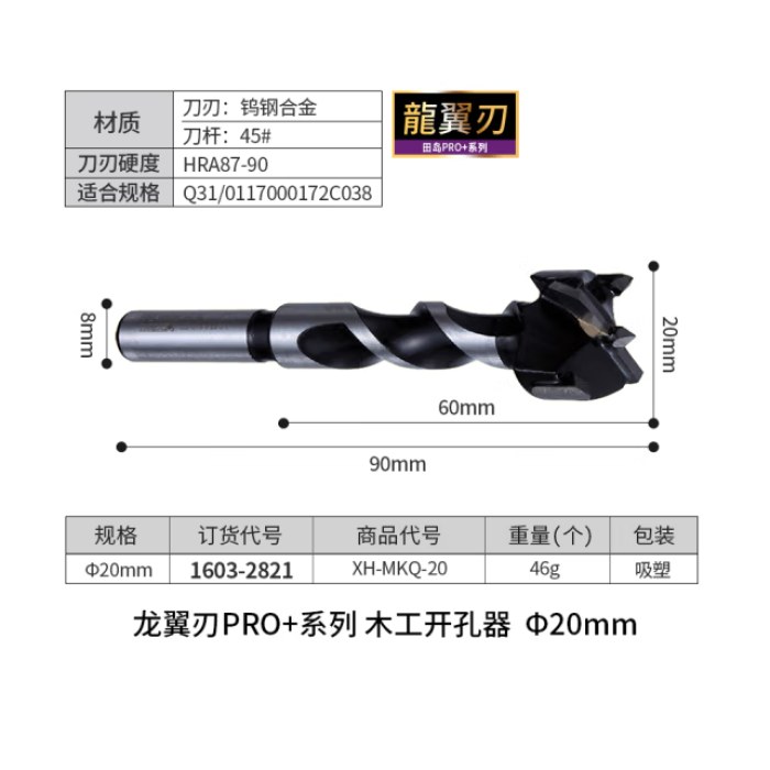 田岛木工开孔器钻头打孔扩孔器钨钢合金钻孔器打孔钻头田岛Tajima工具 龙翼刃20mm木工开孔器1603-2821