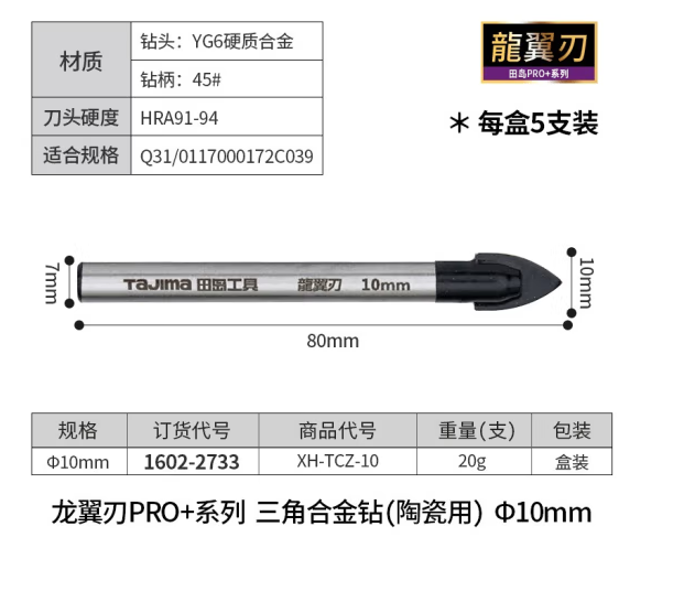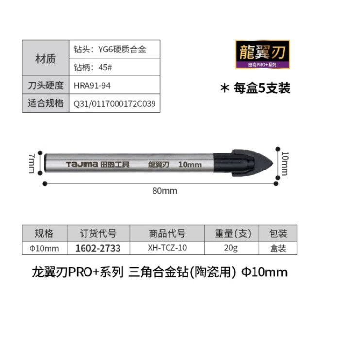 田岛(TAJIMA)日本TAJIMA三角合金钻瓷砖钻陶瓷玻璃钻头打孔黑漆防锈专业陶瓷钻 龙翼刃10mm(5支装1602-2733