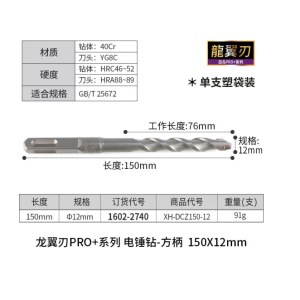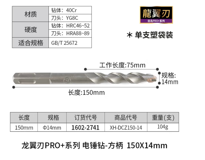 田岛日本Tajima电锤钻头冲击方柄钻头混凝土穿墙钻头打孔电镐凿子电钻 龙翼刃方柄150x14mm1602-2741