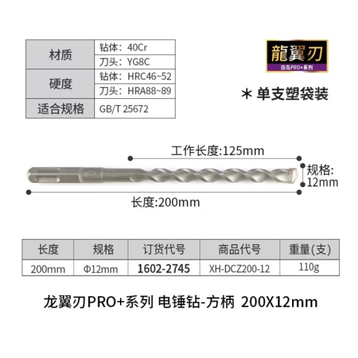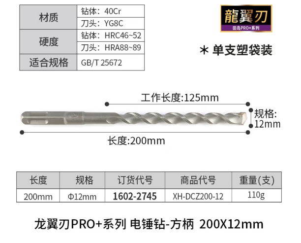 田岛日本Tajima电锤钻头冲击方柄钻头混凝土穿墙钻头打孔电镐凿子电钻 龙翼刃方柄200x12mm1602-2745