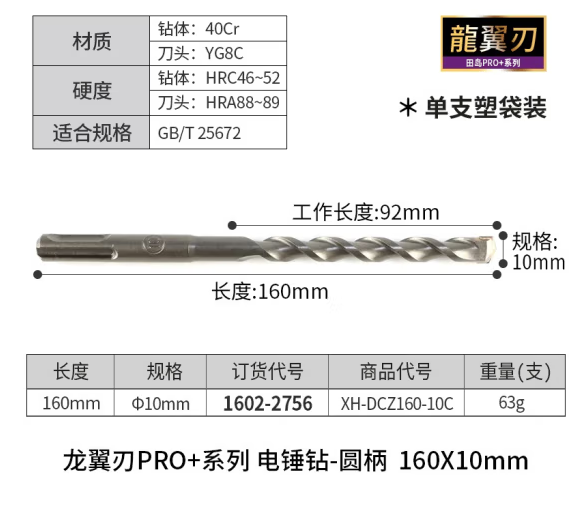 田岛(TAJIMA)田岛电锤钻头冲击钻头圆柄钻头混凝土穿墙钻头打孔电镐凿子电钻头 龙翼刃160X10mm1602-2756