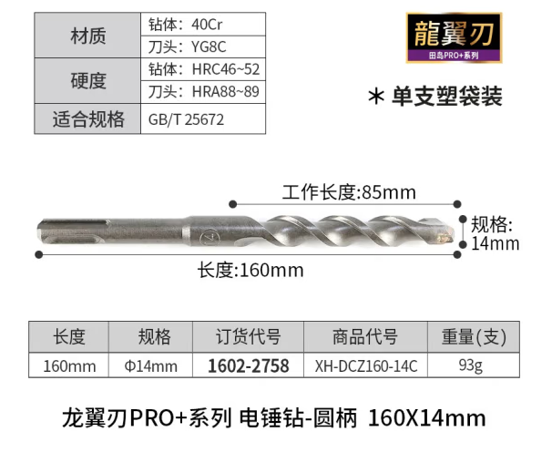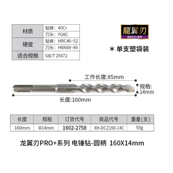 田岛(TAJIMA)田岛电锤钻头冲击钻头圆柄钻头混凝土穿墙钻头打孔电镐凿子电钻头 龙翼刃160X14mm1602-2758