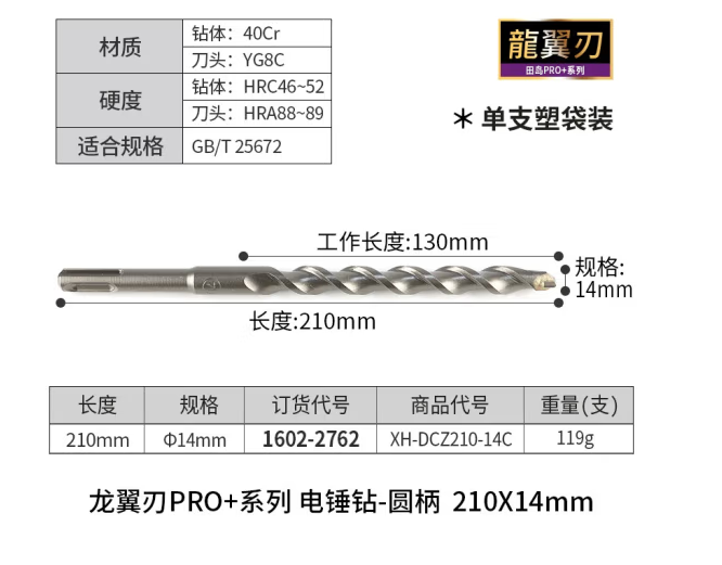 田岛(TAJIMA)田岛电锤钻头冲击钻头圆柄钻头混凝土穿墙钻头打孔电镐凿子电钻头 龙翼刃210X14mm1602-2762