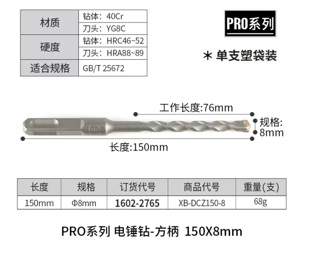 田岛(TAJIMA)日本TAJIMA电锤钻头冲击方柄钻头混凝土穿墙钻头打孔电镐凿子电钻 电锤钻方柄150x8mm 1602-2765