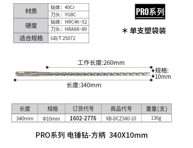 田岛(TAJIMA)日本TAJIMA电锤钻头冲击方柄钻头混凝土穿墙钻头打孔电镐凿子电钻 电锤钻方柄340x10mm 1602-2776