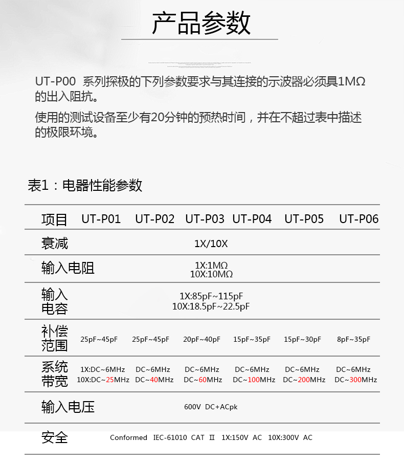 优利德(UNI-T)UT-P06 示波器探头 探针 无源探极 300M带宽 UT-P06