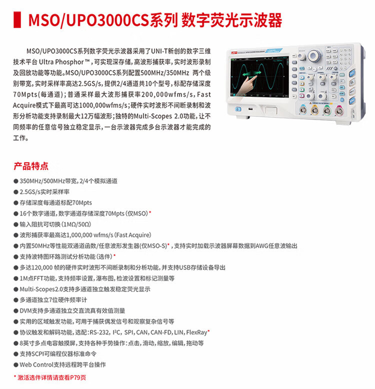 优利德(UNI-T)数字荧光示波器 高精度2/4通道多功能500M带宽 MSO3502CS