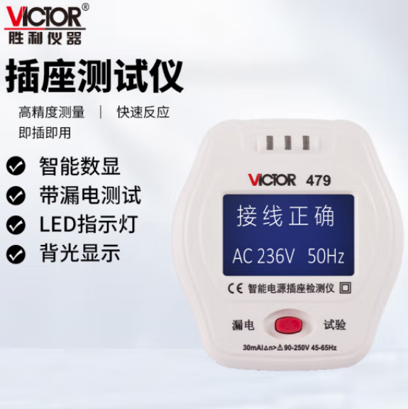 胜利仪器(VICTOR) 插座测试仪 漏电测试 智能电源插座检测仪 地线 零线 火线测试仪 VC479