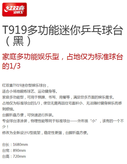 红双喜(DHS)乒乓球桌T919 (黑)儿童小尺寸室内乒乓球台训练用乒乓球案子