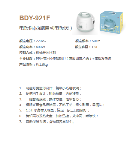 博堡 BDY-921F 电饭锅(西施自动电饭煲)