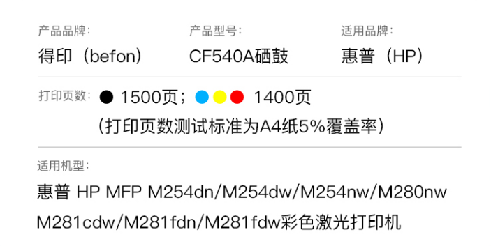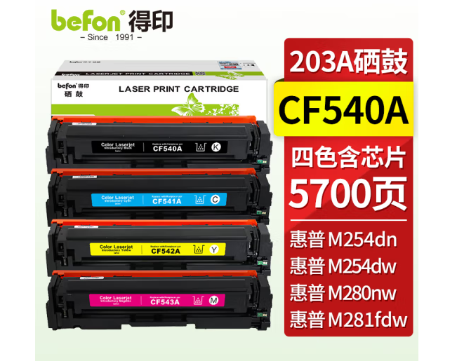 befon得印CF540A 标准容量 四色硒鼓套装 适用惠普HP M254dn/M254dw/M254nw/M280nw/M281fdn/M281fdw