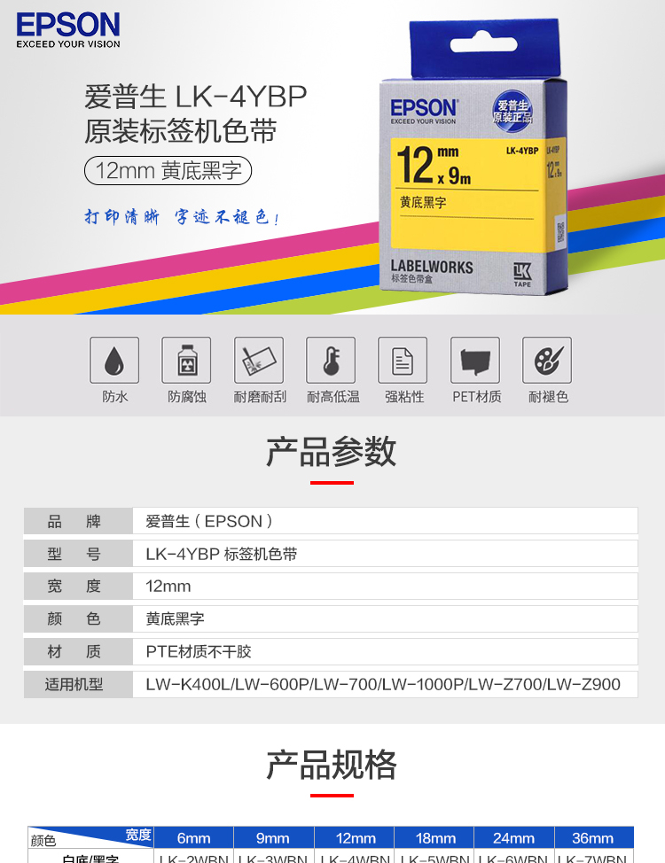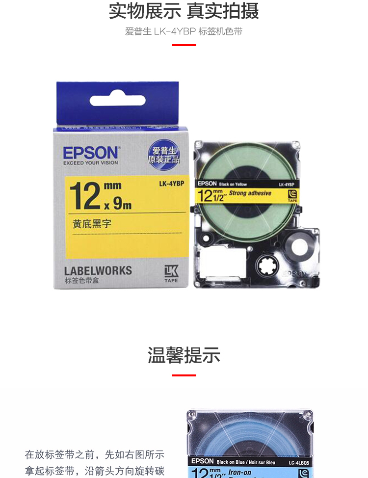 爱普生 LK-4YBP 标签机色带 12mm黄底黑字(LW-K400L/LW-600P/LW-700/LW-1000P/LW-Z700)(企业版)
