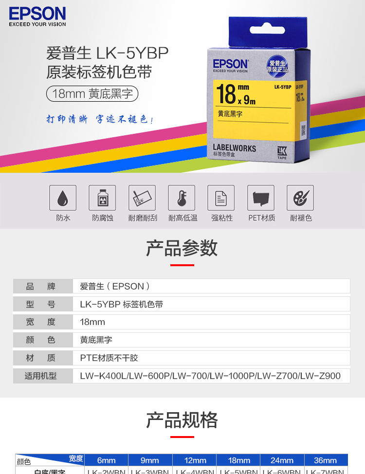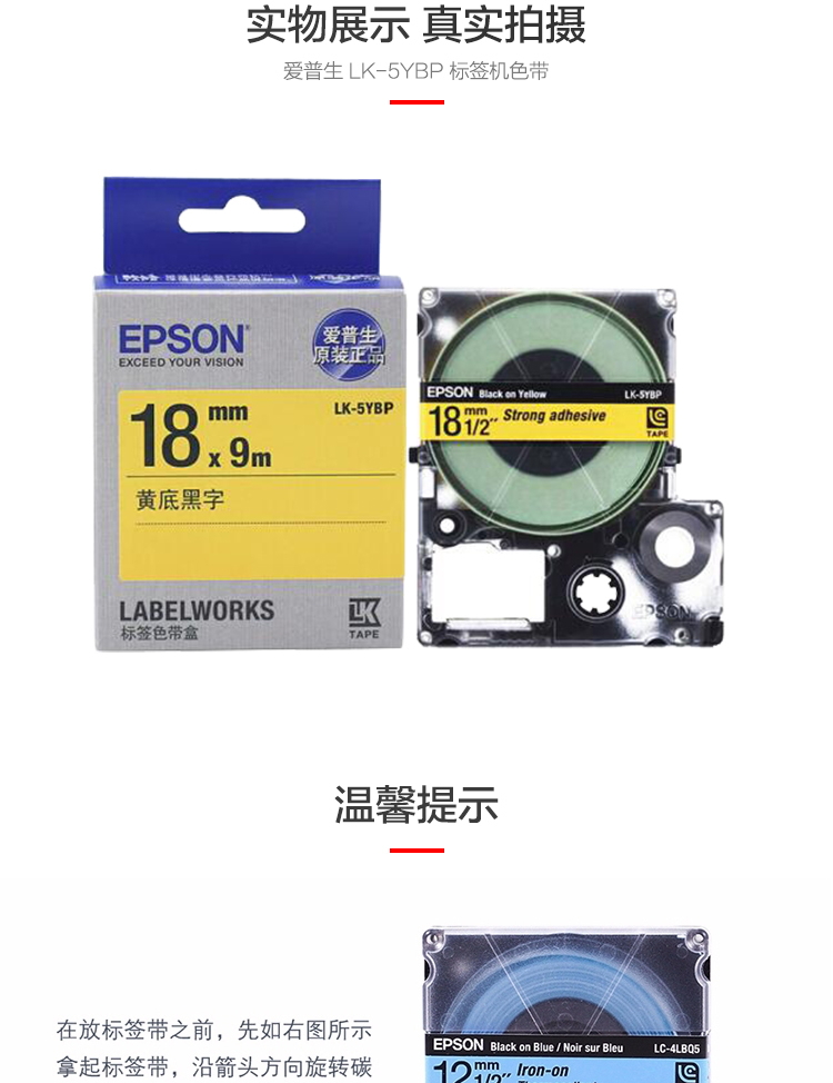 爱普生(EPSON)LK-5YBP 标签机色带 18mm 黄底黑字 (LW-K400L/LW-600P/LW-700/LW-1000P/LW-Z700)(企业版)