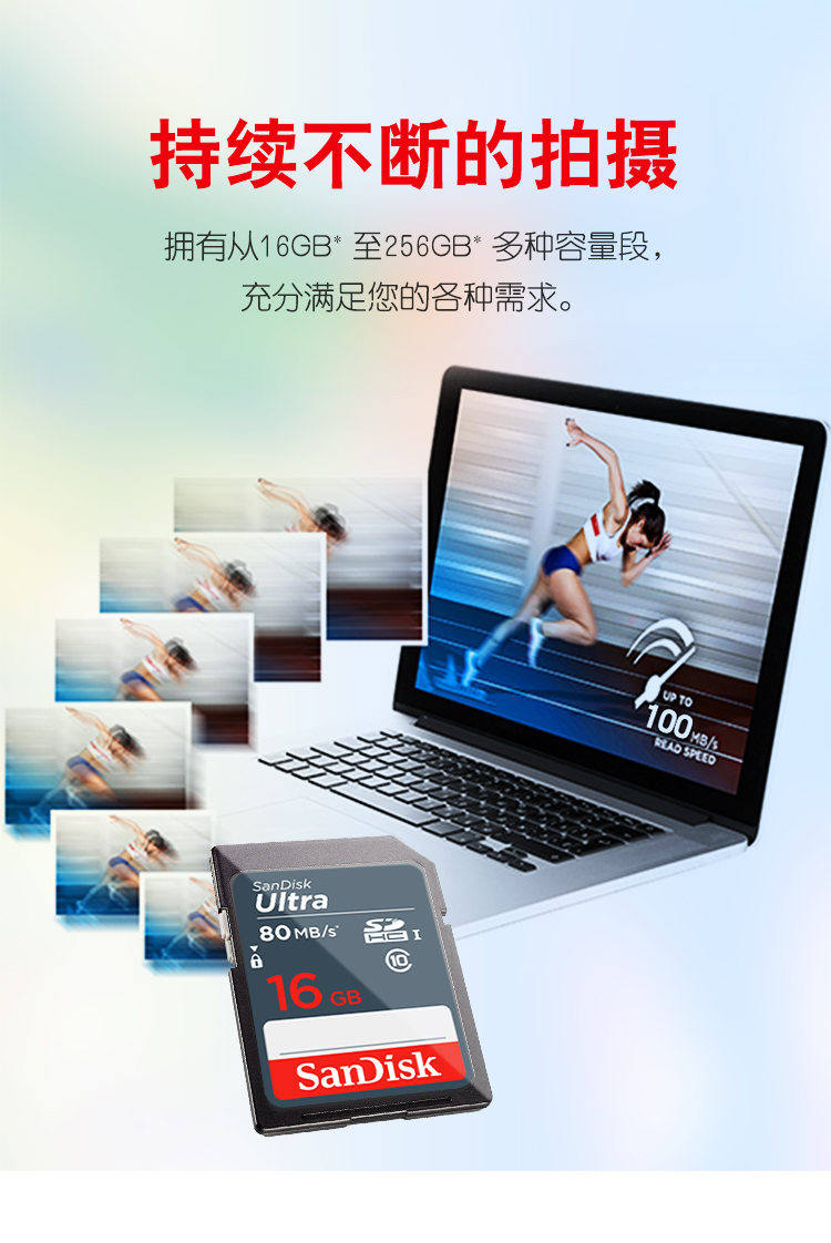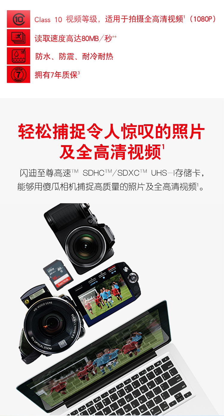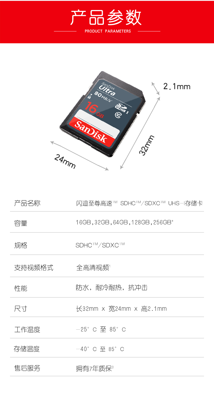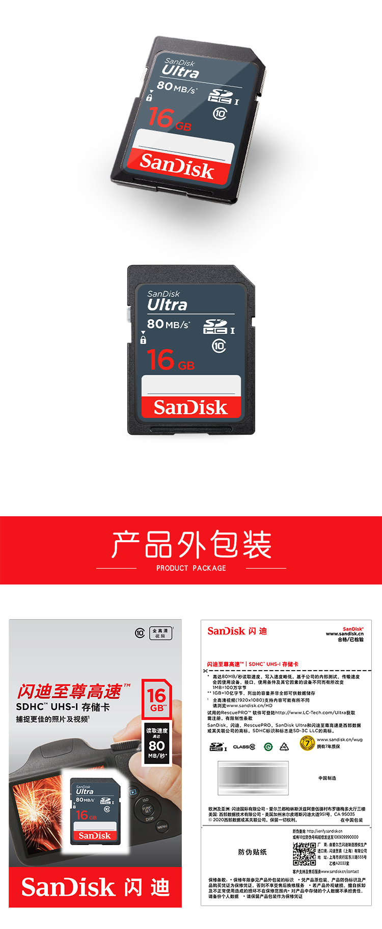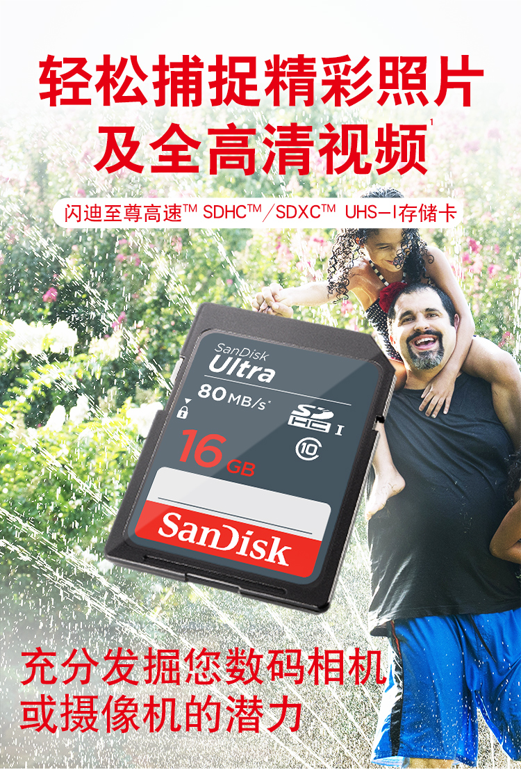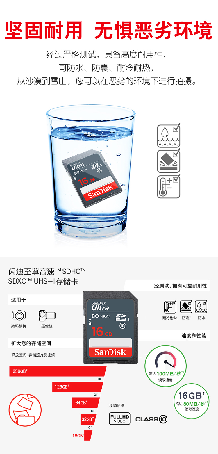 闪迪(SanDisk)16GB SD存储卡 C10 至尊高速版 读速80MB/s 写速10MB/s 耐冷耐热 防水抗冲击 SDSDUNB-016G-ZN3IN