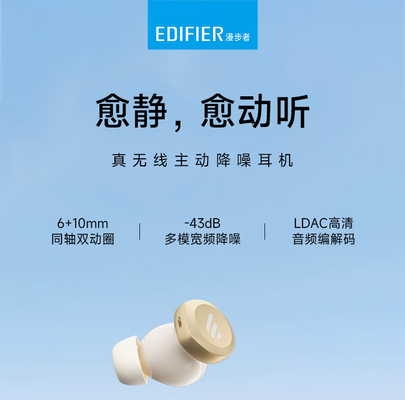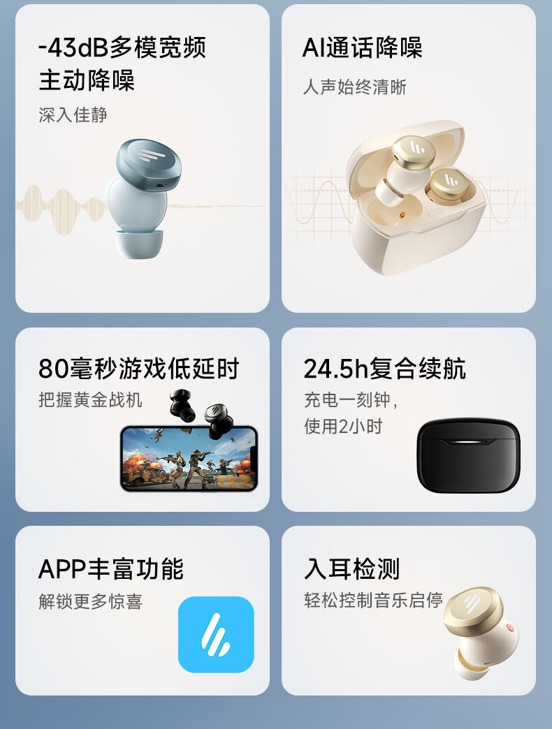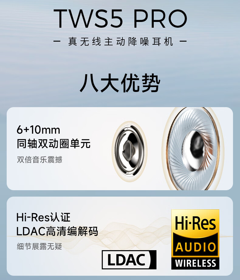 漫步者(EDIFIER)TWS5 PRO真无线主动降噪耳机 蓝牙耳机 运动耳机 适用苹果华为小米手机 薄雾蓝