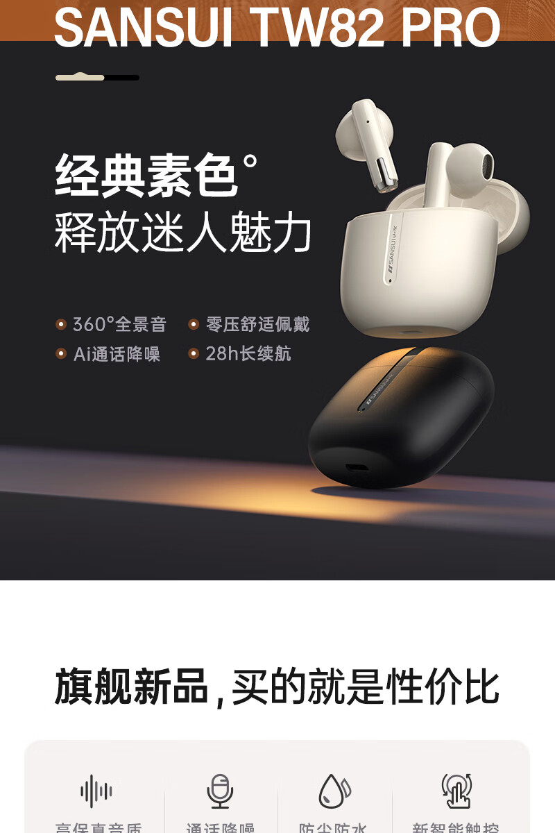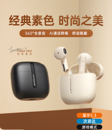 山水(SANSUI)TW82真无线蓝牙耳机 半入耳式音乐耳机 超长续航 适用苹果华为小米 黑