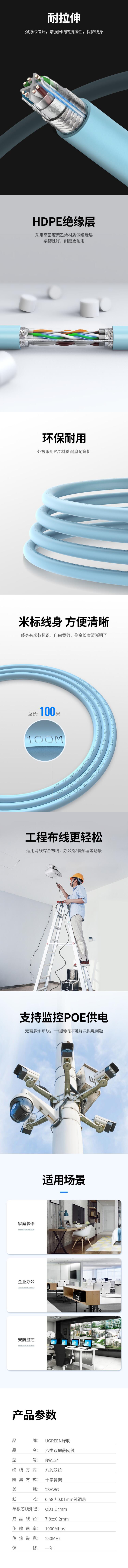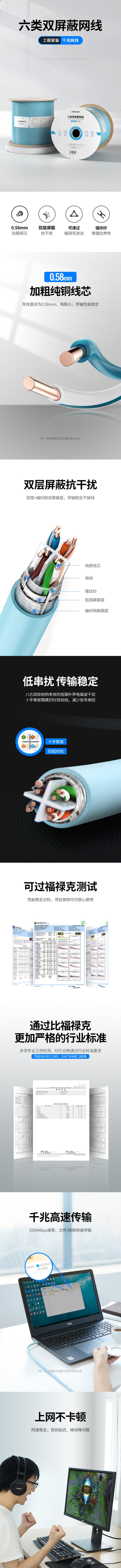 绿联(UGREEN)40319 六类双屏蔽千兆网线 【0.58mm纯铜线芯】 CAT6类8芯双绞屏蔽工程箱线100米