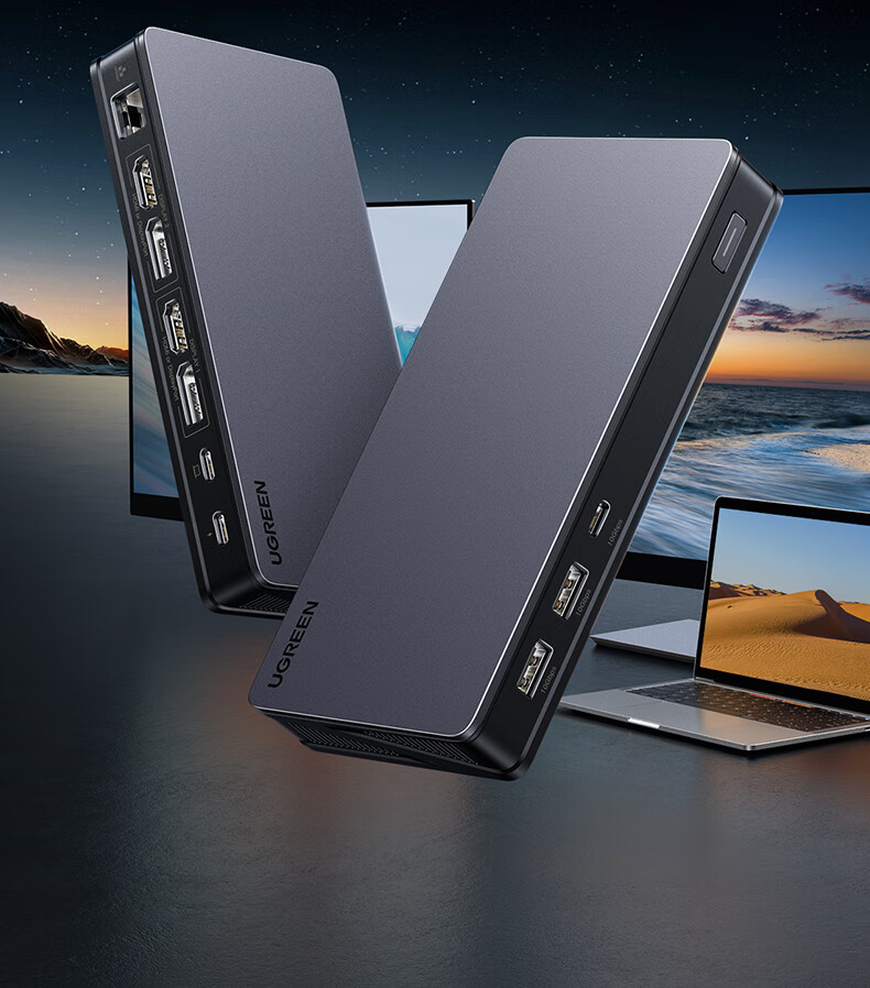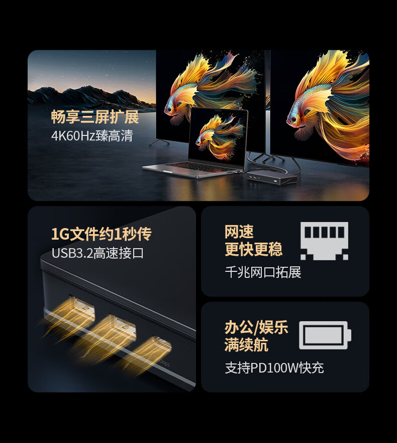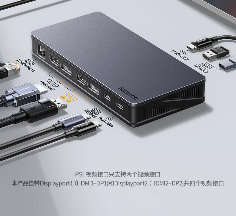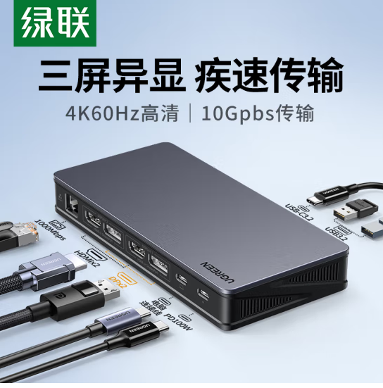 绿联90912 Type-C扩展坞USB-C转HDMI转接头分线器 千兆网口DP1.4雷电3/4转换器4K60Hz 三屏异显苹果Mac笔记本拓展坞