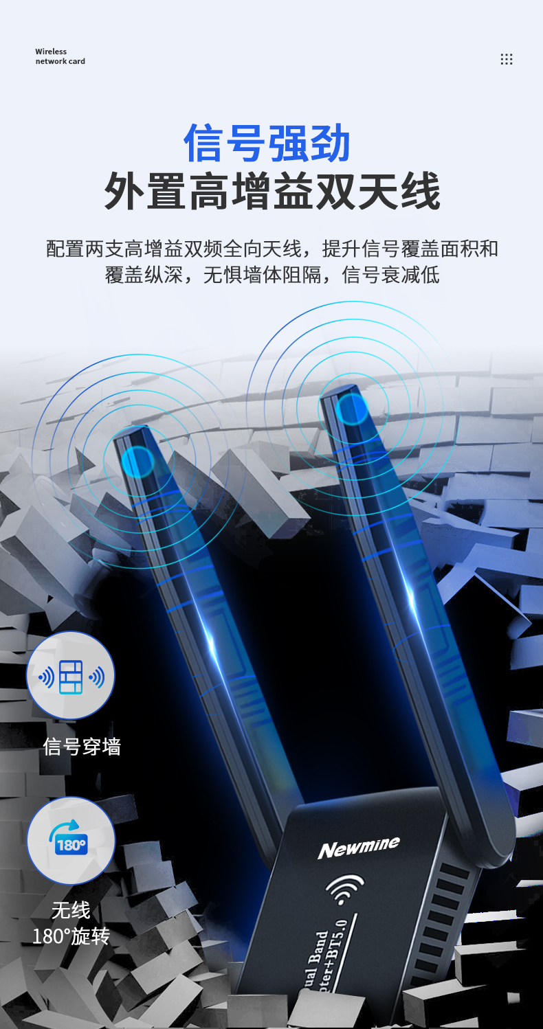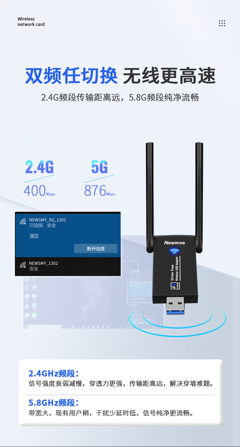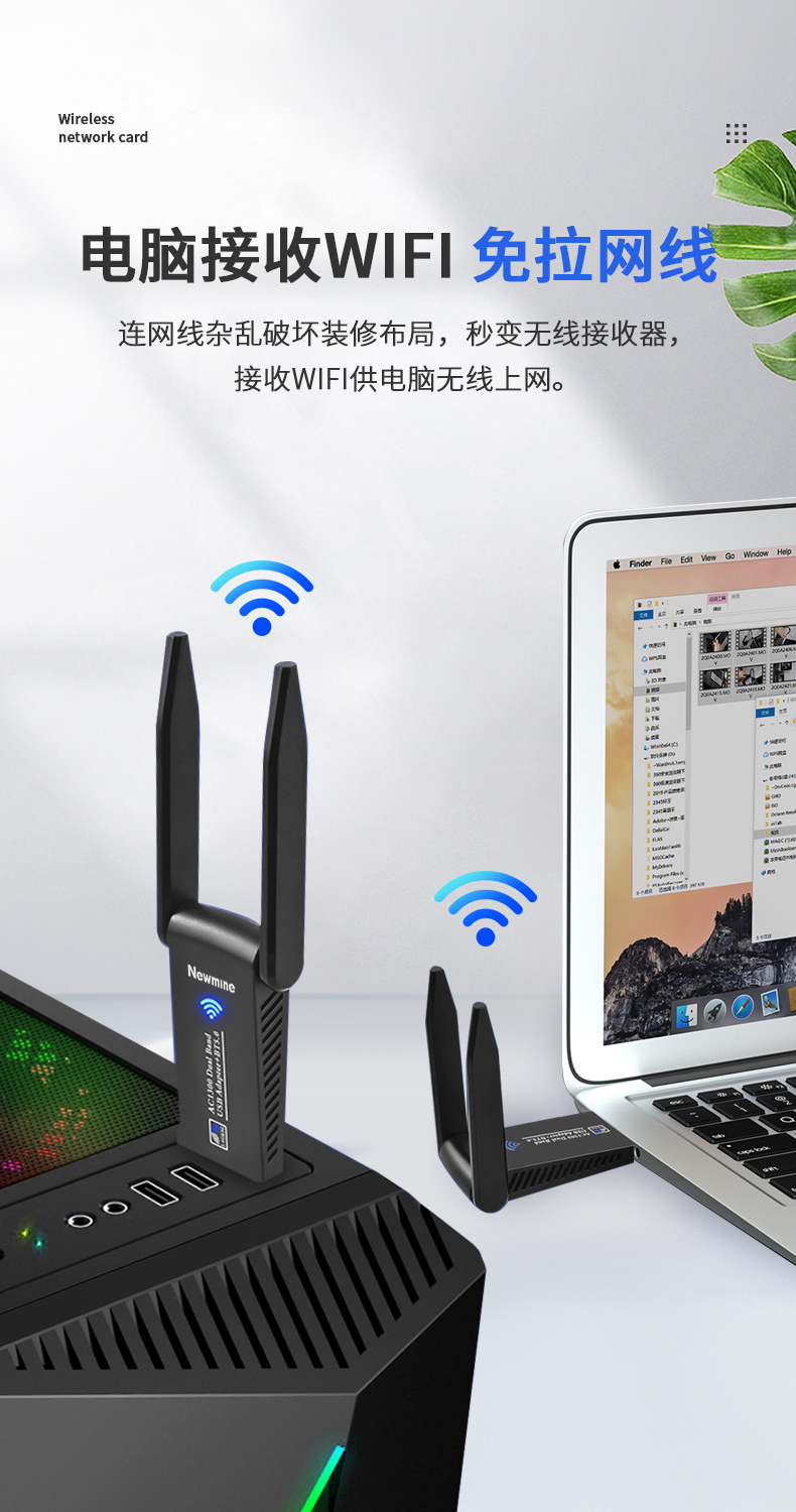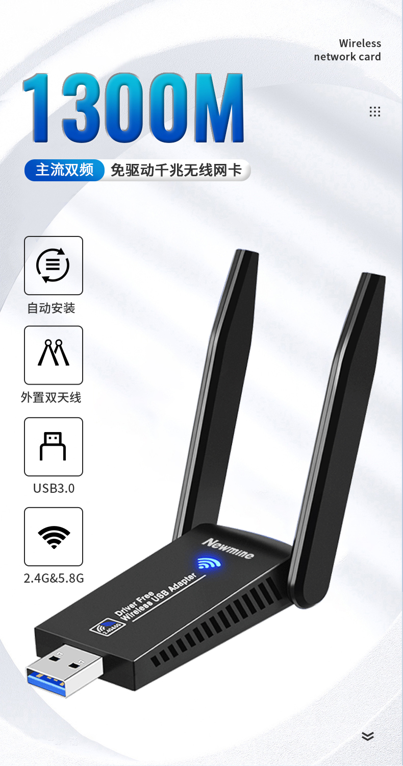 纽曼(Newmine)D1302免驱版 1300M免驱版 USB无线网卡 千兆5G双频随身WiFi接收器发射器 外置双天线