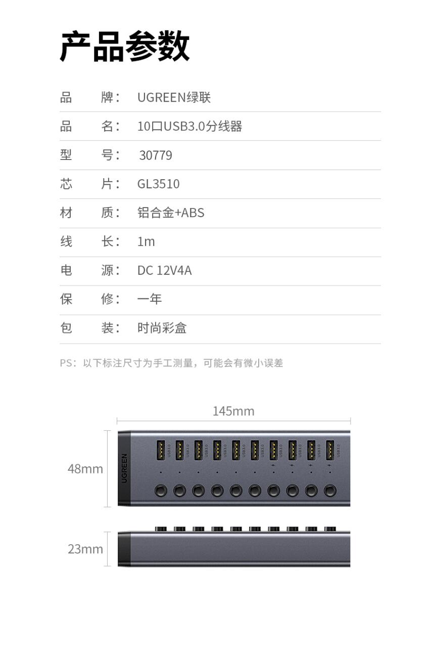 绿联30779 USB3.0分线器 高速10口拓展坞HUB集线器 一拖十转接头转换器延长线带电源适配器 1米