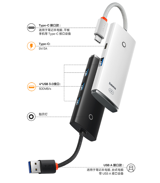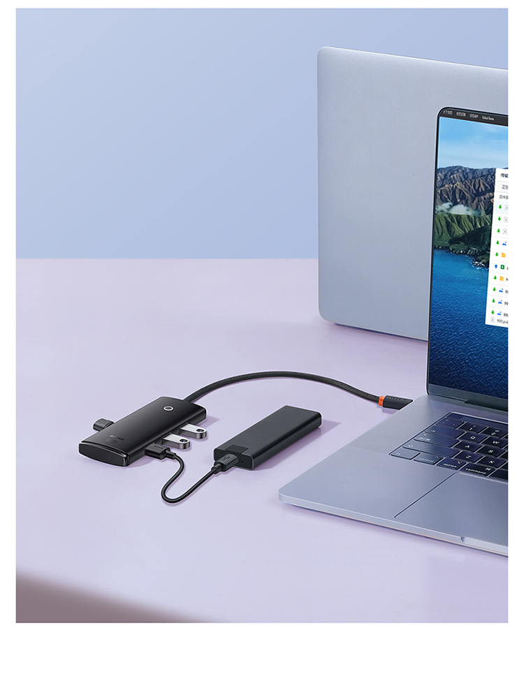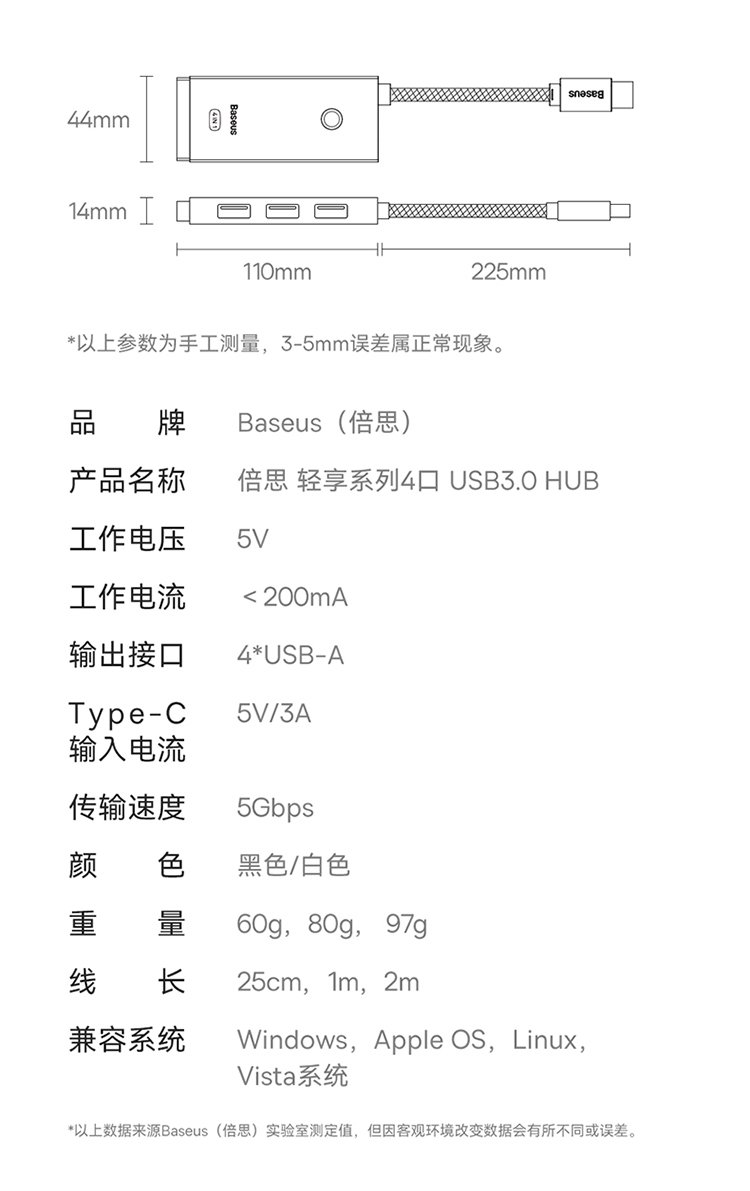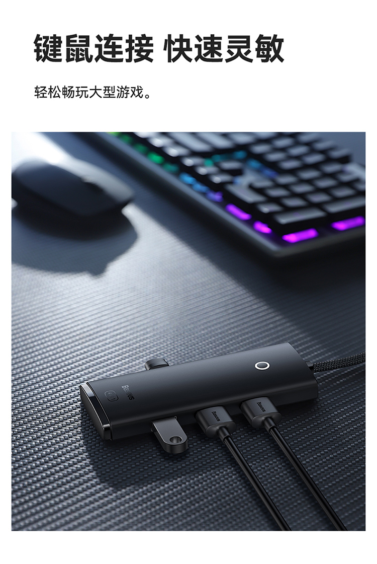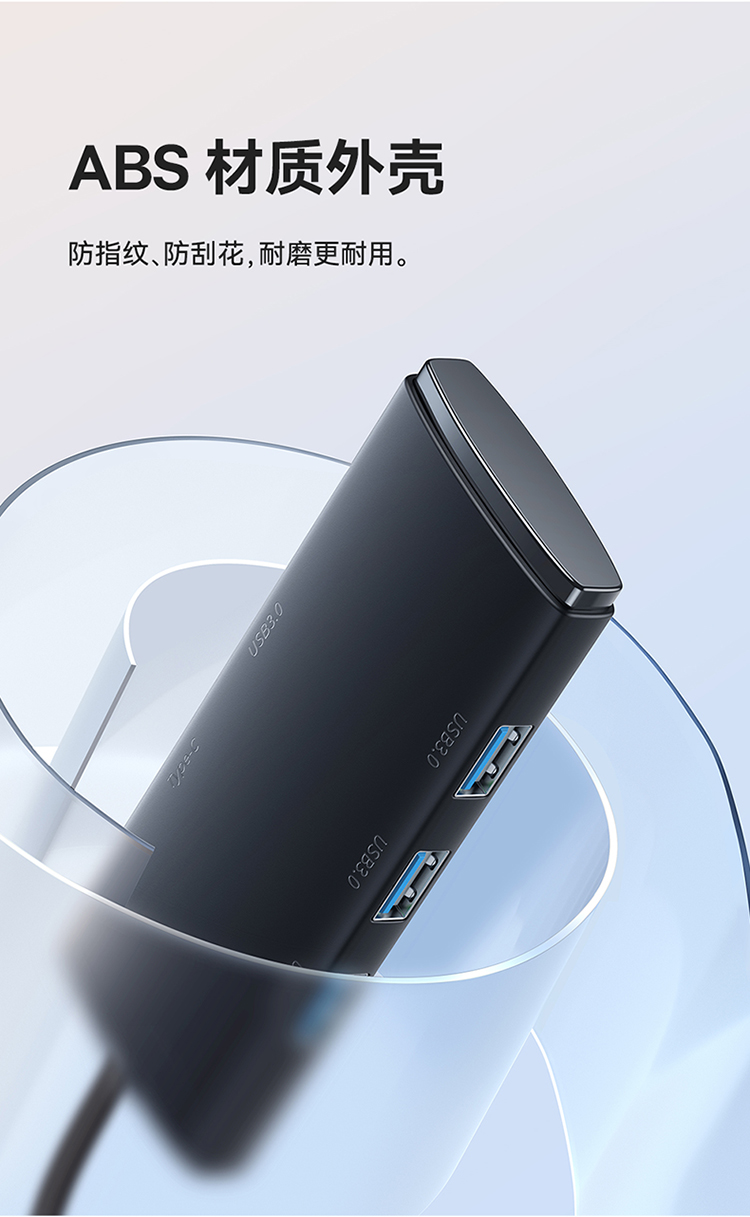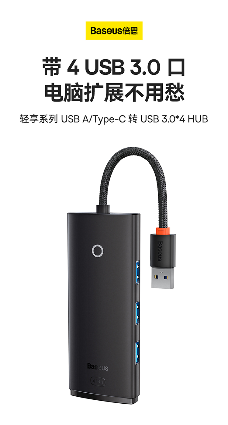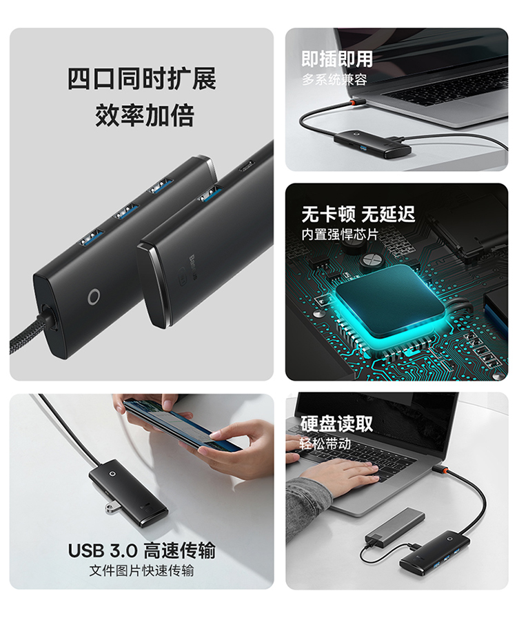 倍思 USB3.0分线器转换器 适用苹果华为笔记本电脑通用转接头 4口USB3.0 HUB 2米黑色