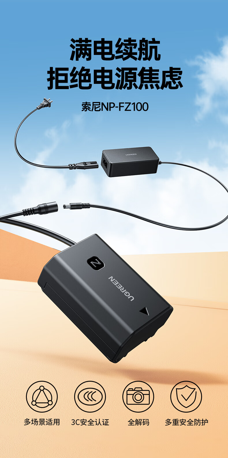 绿联15314 索尼FZ100相机假电池 适用sony a7m4 a7m3 a7c a7r3 a9模拟电池电源适配器 微单电池录像供电